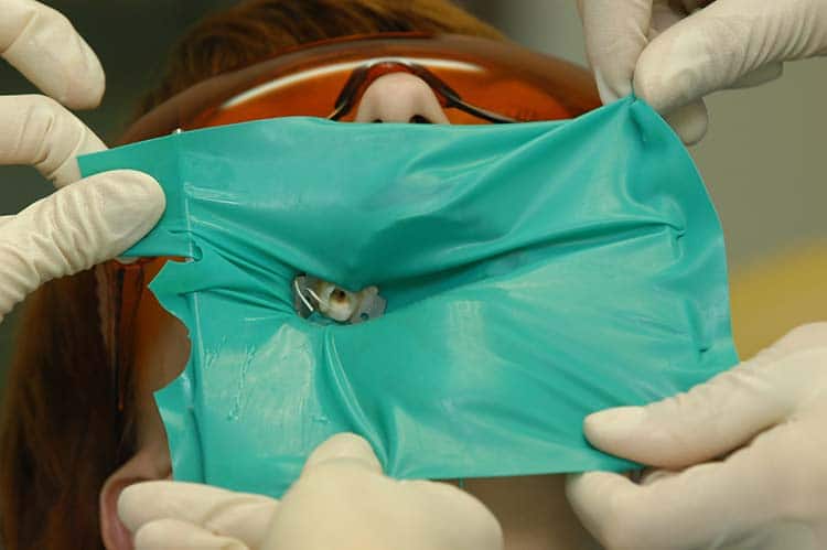 After a local anaesthetic to numb the tooth and the surrounding area, a dental dam is placed over the tooth to keep it clean and free of saliva.